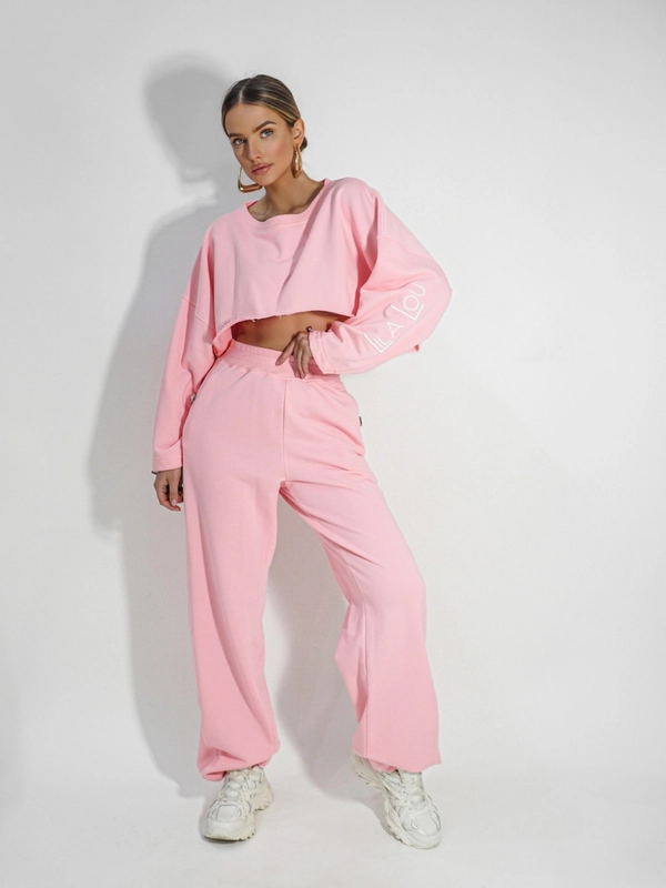 ALEX tracksuit is an undeniable HIT! Short sweatshirt with adjustable drawstrings perfectly emphasizes the silhouette. On the left sleeve a large embroidered white inscription LilaLou. Long pants with legs ending in adjustable drawstrings. The pants have pockets on the front and a large raised white embroidery with the LilaLou logo on the back.