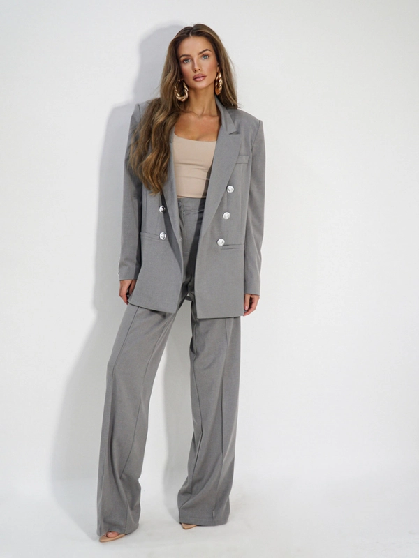 Women's DEFINE ME suit with a classic masculine cut is the essence of nonchalance and elegance in a feminine way. Double-breasted blazer and wide, long straight cut pants are a perfect set as well as a base for a variety of styles. It looks beautiful with a white shirt as well as your favorite t-shirt. In combination with stilettos, it will make your legs optically gain up to a dozen centimeters, and the whole silhouette will be slightly slenderized.