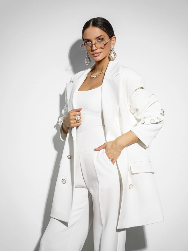 KARL jacket is our oversized proposal of elegance. The advantages of the jacket are: gold buttons at the sleeves and on the front, delicate shoulder pads, two pockets on the front, which are not dummy :) the jacket perfectly matches with TERESA or DIVID pants. Combined this way, it makes a beautiful suit. Another advantage is that it can be worn unzipped or has an invisible button inside that fastens from the inside.