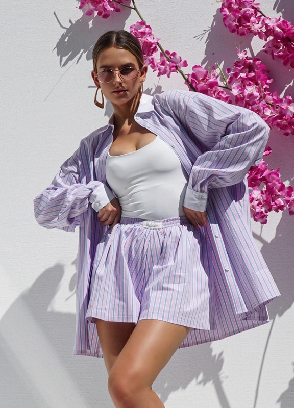 MILA set is the perfect choice for summer! Oversize shirt provides comfort and freedom of movement, while shorts with elastic waistband ensure comfortable all-day wear. It's a combination of style and functionality that will work well both on the beach and at a gathering with friends. Must-have in every holiday closet.