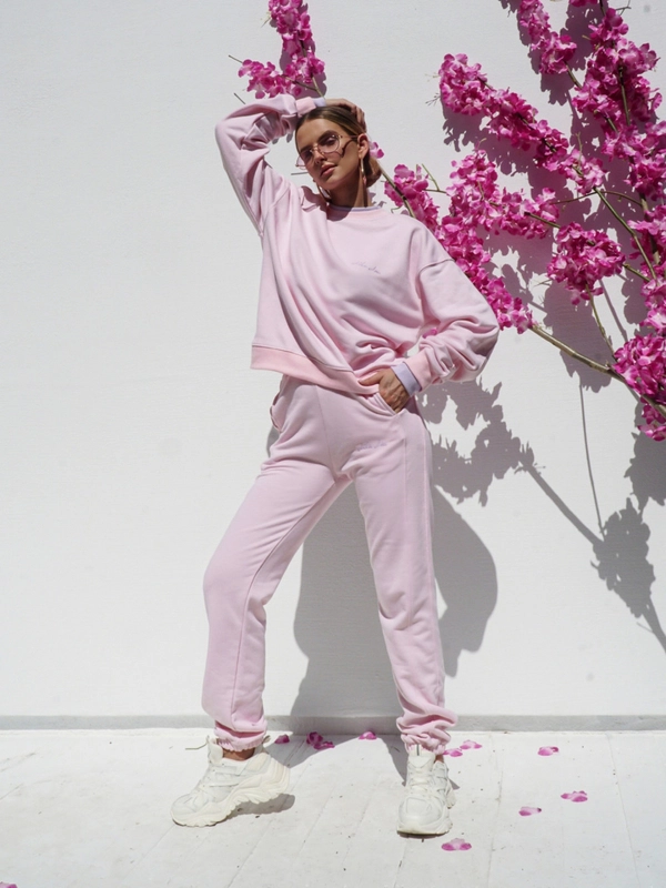 Comfortable and stylish two-piece tracksuit. Made of high-quality cotton with a touch of elastane, which guarantees comfort and provides great freedom of movement. Decorated with subtle white embroidery of the LilaLou logo on the sweatshirt. Sweatshirt has additional color inserts at the collar and sleeves. The pants have a wide elastic waistband, so the pants fit well. Trouser legs finished with a welt.