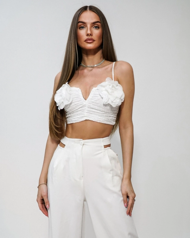 Rose top is the perfect option for women who love unique clothes! Decorated with a 3D rose, with adjustable straps, invisible zip at the side and a delicate elastic at the back, they fit perfectly under jackets and with our BELL, FABOULUS or HEELS UP pants.