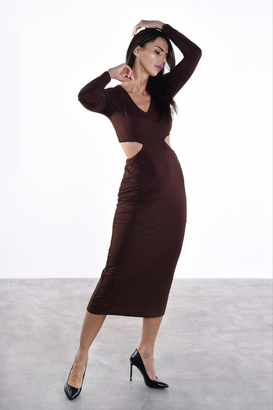 Red dress YOU NEED ME is a classic with remarkable cutouts on the sides. Midi length, pencil cut and long sleeves are quintessential classics. V-shaped neckline optically slims the neck and emphasizes the bust. It will delight you with its feminine cut, which will perfectly emphasize the assets of your silhouette. It must not be missing from your closet.