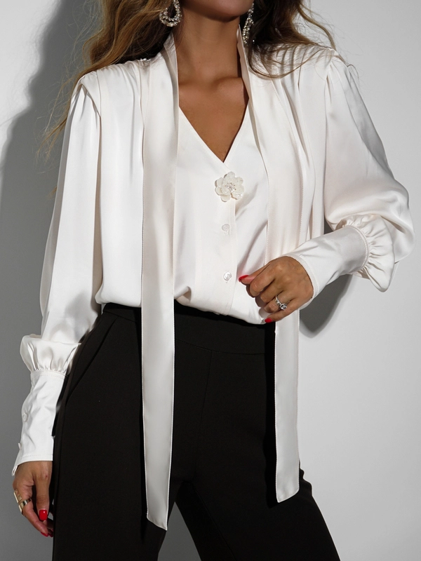 Elegancka koszula damska, wykonana z lekkiego materiału. Posiada długie, delikatnie bufiaste rękawy zakończone mankietem oraz subtelne marszczenia przy ramionach. Wiązanie przy dekolcie nadaje całości szykownego charakteru, idealnego zarówno do biura, jak i na specjalne okazje. Świetnie komponuje się ze spódnicą, garniturem czy eleganckimi spodniami.