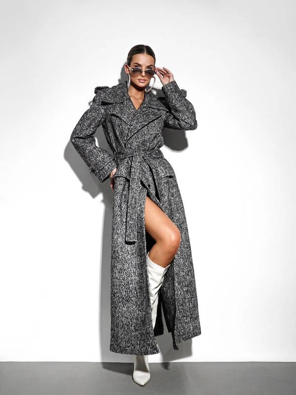 Postaw na ponadczasową elegancję w nowoczesnym wydaniu. Ten długi płaszcz o klasycznym kroju to kwintesencja stylu i kobiecości. Model charakteryzuje się szerokimi klapami, paskiem podkreślającym talię oraz subtelnymi detalami w postaci pagonów i mankietów z paskami. Dzięki dopasowanemu fasonowi pięknie modeluje sylwetkę, zachowując przy tym swobodę ruchu i komfort noszenia. Idealnie sprawdzi się zarówno do eleganckich stylizacji z sukienką i kozakami, jak i w codziennych zestawach z jeansami i botkami. Ten płaszcz to obowiązkowy element garderoby każdej kobiety ceniącej klasę i minimalizm.