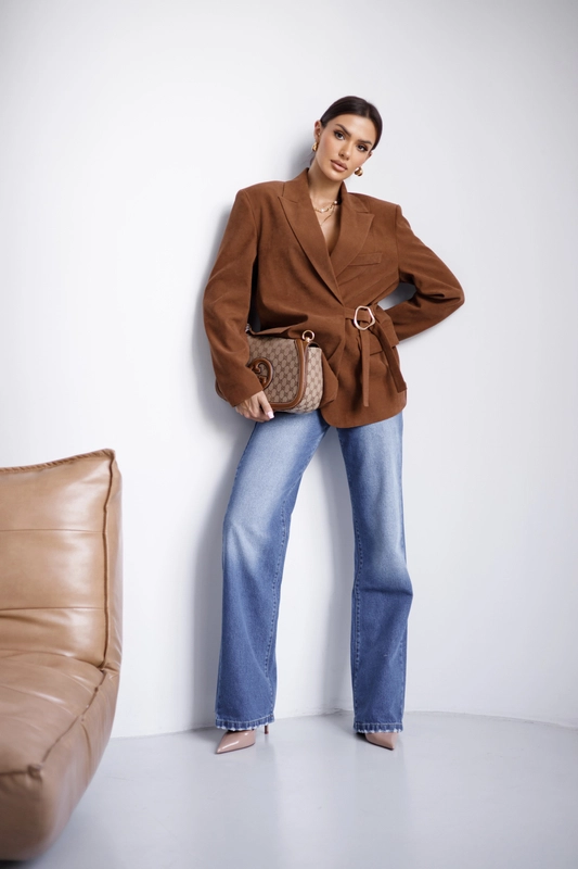 Klasyka z nowoczesnym akcentem. Ten elegancki, strukturalny żakiet to must-have w każdej kobiecej garderobie. Minimalistyczna forma została przełamana efektowną złotą klamrą, która pełni funkcję zarówno praktyczną, jak i dekoracyjną. Połącz go z jeansami dla luźniejszego looku lub ze spodniami materiałowymi, by stworzyć elegancki zestaw do biura czy na wieczorne wyjście.