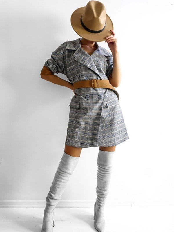 Sukienka ARLES to wyjątkowy element garderoby, który łączy w sobie elegancję i nowoczesny styl. Jej podwójne zapięcie oraz dopasowany krój podkreślają sylwetkę, nadając jej klasycznego, a zarazem modnego wyglądu. Mini długość sprawia, że sukienka jest idealna na różne okazje, od spotkań towarzyskich po bardziej formalne wyjścia. W połączeniu z brązowym paskiem i kozakami do kolan, całość tworzy świetny, harmonijny look.