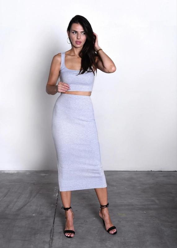 Komplet ISABEL wykonany z wysokiej jakości dzianiny, bardzo rozciągliwy! Składa się z topu oraz długiej, ołówkowej spódnicy. Idealny zarówno do eleganckich look'ów, jak i sportowych, można nosić oddzielnie i dopasowywać do różnych stylizacji.
