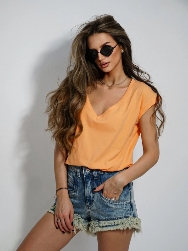 Nasz bestsellerowy t-shirt z dekoltem w serek! Najlepszej jakości bawełna zapewni wysoki komfort noszenia, a prosty i zarazem ciekawy krój zwróci na Ciebie uwagę wszystkich. Idealnie pasuje do jeansów, spódnic, spodni cygaretek, spódnic ołówkowych, pod żakiet, kardigan, ramoneskę czy bluzę. Ten t-shirt to obowiązkowy MUST HAVE każdej kobiety!