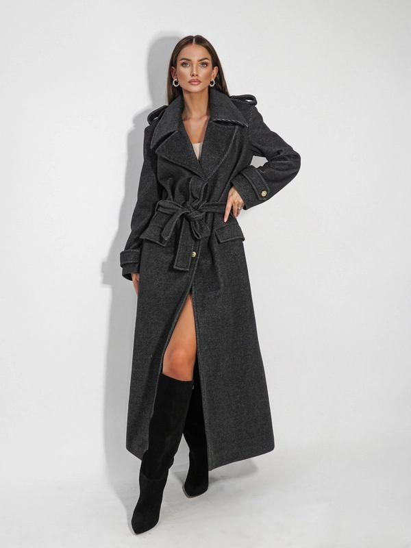 Postaw na ponadczasową elegancję w nowoczesnym wydaniu. Ten długi płaszcz o klasycznym kroju to kwintesencja stylu i kobiecości. Model charakteryzuje się szerokimi klapami, paskiem podkreślającym talię oraz subtelnymi detalami w postaci pagonów i mankietów z paskami. Dzięki dopasowanemu fasonowi pięknie modeluje sylwetkę, zachowując przy tym swobodę ruchu i komfort noszenia. Idealnie sprawdzi się zarówno do eleganckich stylizacji z sukienką i kozakami, jak i w codziennych zestawach z jeansami i botkami. Ten płaszcz to obowiązkowy element garderoby każdej kobiety ceniącej klasę i minimalizm.