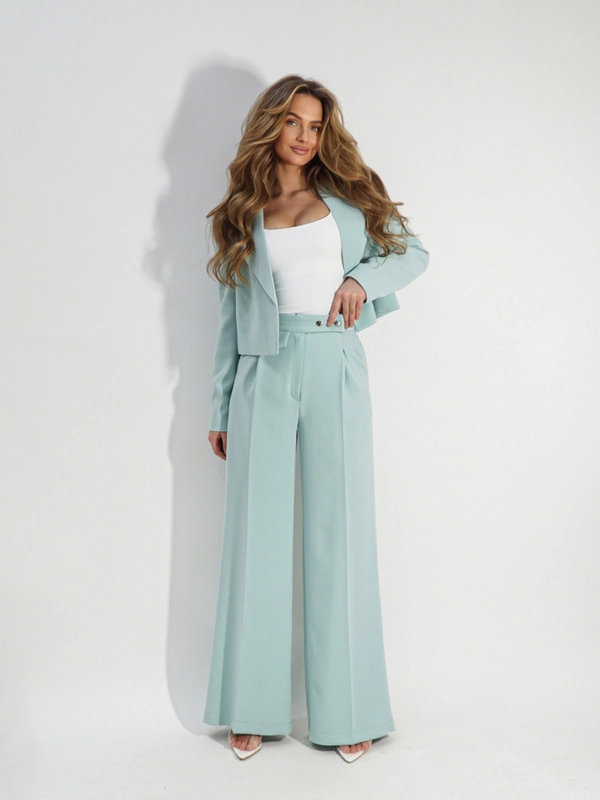 Nowoczesna elegancja w wyjątkowym wydaniu. Krótka, minimalistyczna marynarka podkreśla sylwetkę, a szerokie spodnie nadają całości lekkości i charakteru. Idealny wybór zarówno do pracy, jak i na specjalne okazje.