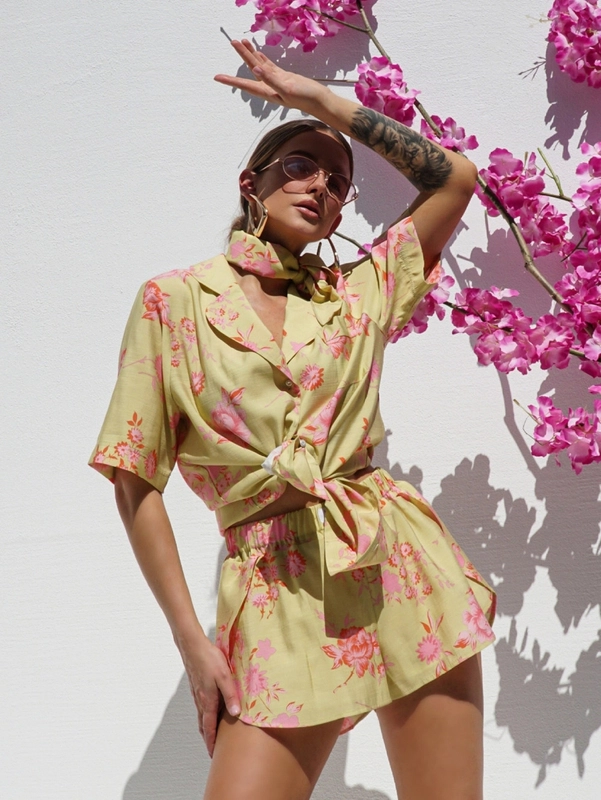 Komplet SANOA to unikatowy wzór, który powinnaś mieć w swojej szafie na nadchodzące lato. Krótkie szorty, koszula, którą możesz wiązać na różne sposoby i chusta, która dodaje uroku każdej kobiecie. Wybierz swój print SANOA i poczuj się jak milion dolarów! Spodenki mają wszytą podszewkę dzięki której nic nie prześwituje.