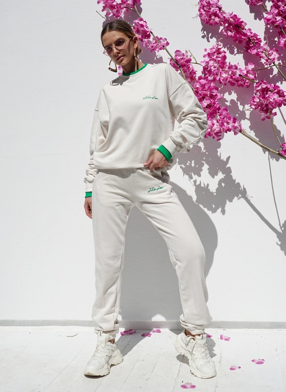 Wygodny i stylowy dres dwuczęściowy. Wykonany z wysokiej jakości bawełny z domieszką elastanu, co gwarantuje komfort noszenia i zapewnia dużą swobodę ruchów. Ozdobiony subtelnym białym haftem logo LilaLou na bluzie. Bluza posiada dodatkowe wstawki kolorystyczne przy kołnierzyku i rękawach. Spodnie posiadają szeroką gumkę w pasie, dzięki czemu spodnie dobrze leżą. Nogawki w spodniach zakończone ściągaczem.