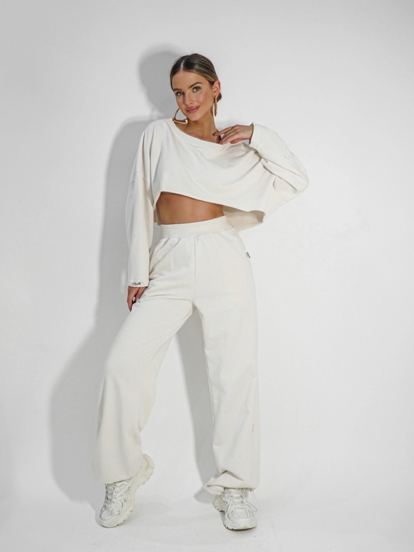 Dres ALEX to niepodważalny HIT! Krótka bluza z regulowanymi ściągaczami idealnie podkreśla sylwetkę. Na lewym rękawie duży wyhaftowany biały napis LilaLou. Długie spodnie z nogawkami zakończonymi regulowanymi ściągaczami. Spodnie posiadają z przodu kieszenie i duży wypukły biały haft z logo LilaLou z tyłu.